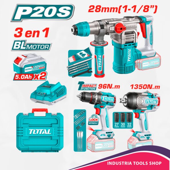 COMBO 20V ROTOMARTILLO 28MM + TALADRO 96NM + LLAVE IMPACTO 1350NM 2X5.0AH + ACC INDUSTRIAL